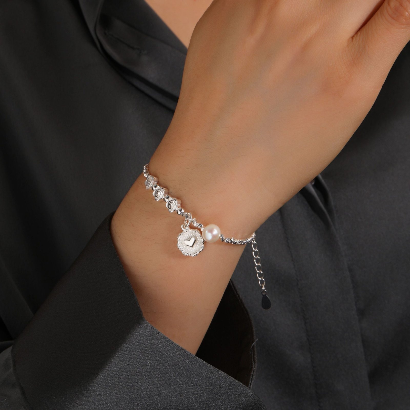 Heart of Roses Charm Bracelet 925 Sterling Silver Baroque Pearl Women’s Fashion Bracelet Gift for Her
