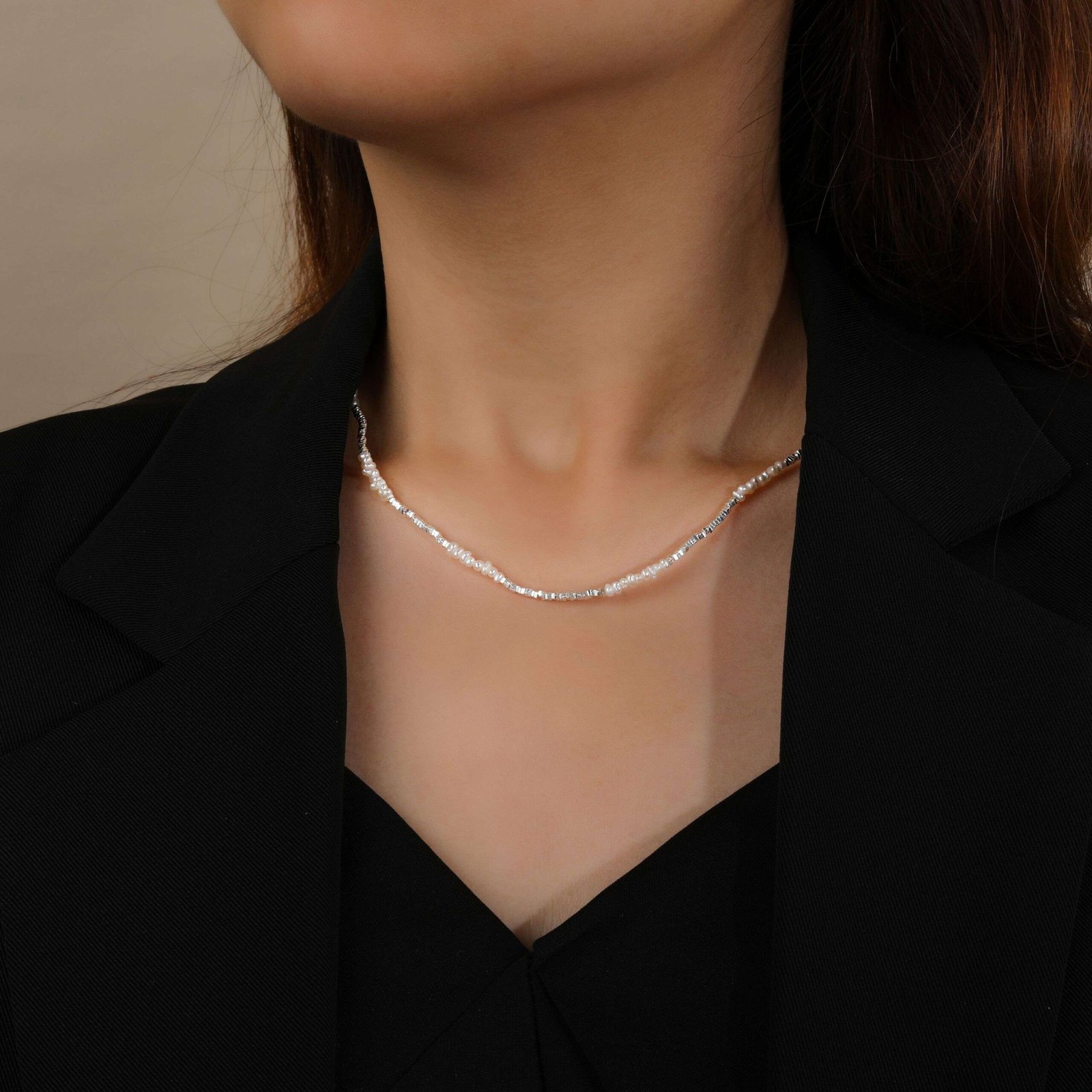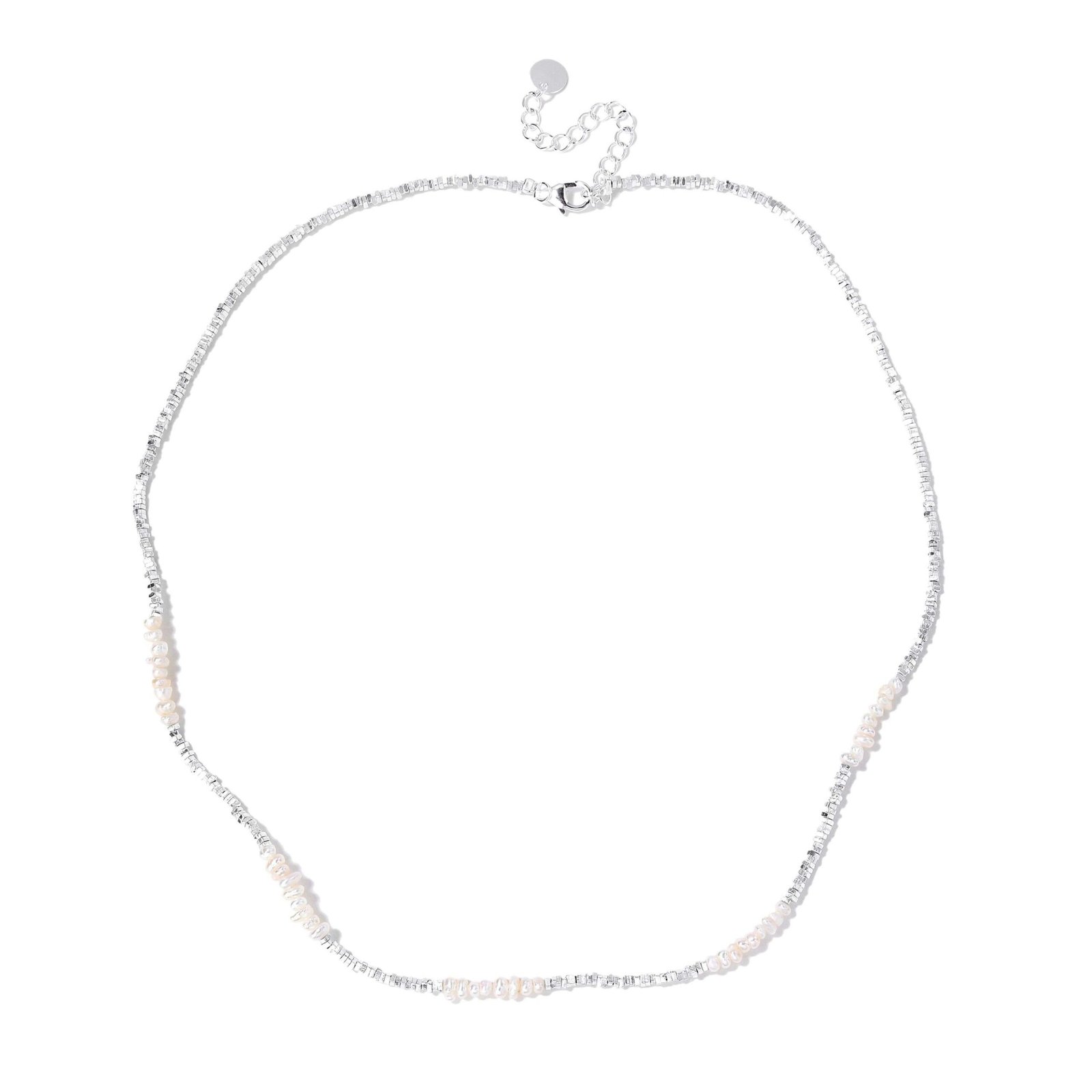 The Pearl Harmony Necklace features a delicate blend of lustrous rice pearls and sparkling sterling silver accents. Handcrafted for a touch of elegance and sophistication, this piece is perfect for adding subtle glamour to any outfit. Ideal for both casual and formal occasions.