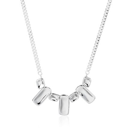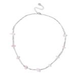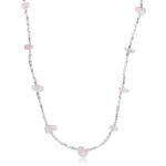 The Pink Crush Necklace is handcrafted with natural Rose Quartz rough stones and 925 sterling silver small beads. Featuring light pink uncut crystals interspersed with shiny, cylindrical silver beads, this necklace offers a soft and elegant look, perfect for everyday wear.